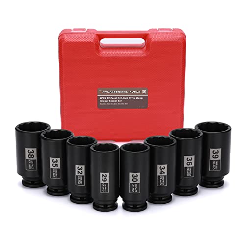 Mayouko 8PCS 1/2" Deep Axle Nut Impact Socket Set, CR-MO, 12 Point Design, Metric, 29,30,32,34,35,36,38,39mm, 1/2 Inch Extra Deep Impact Socket